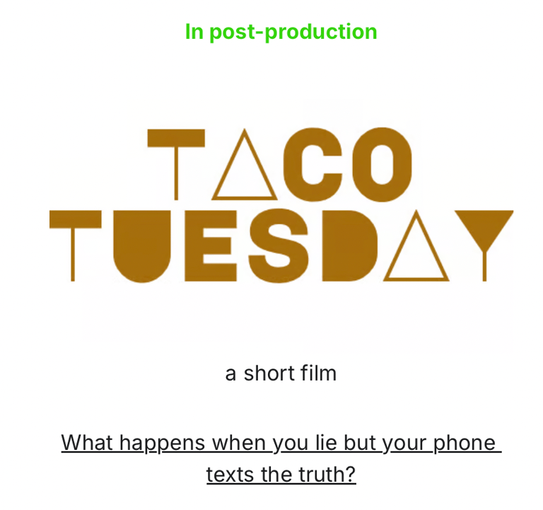 Currently in post-production, Taco Tuesday is a sharp, witty, short film dramedy about honesty, vulnerability, and the cost of minimizing your feelings for acceptance. In a world addicted to filters and half-truths, Darrell learns that sometimes the only way forward is through the uncomfortable truth one text at a time.
